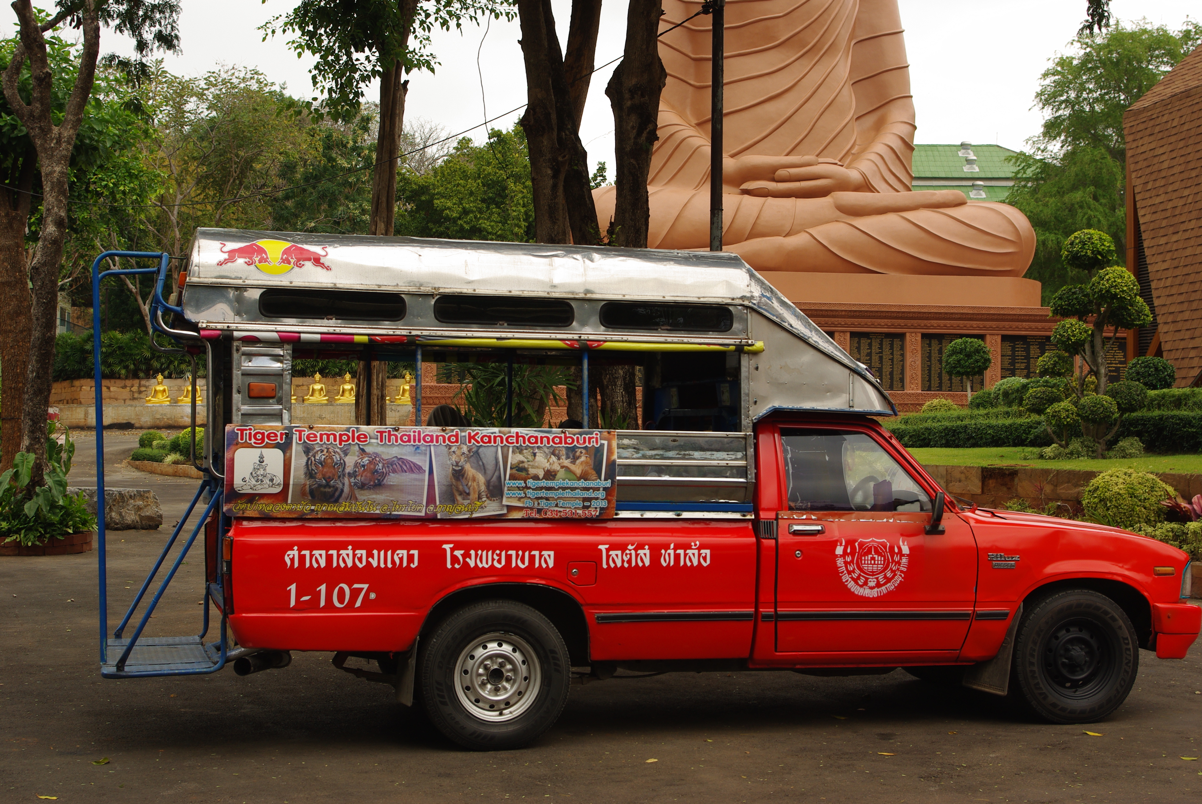 Après nous être plombés le moral par la visite du musée consacré à cette partie de l’histoire, nous sommes partis visiter avec notre moyen de transport du jour : le Wat Tham Khaopoon et le Wat Photisat Banpot Nimit (j’avoue que je ne me lasse pas de vous imaginer en train de lire ces noms exotiques !).