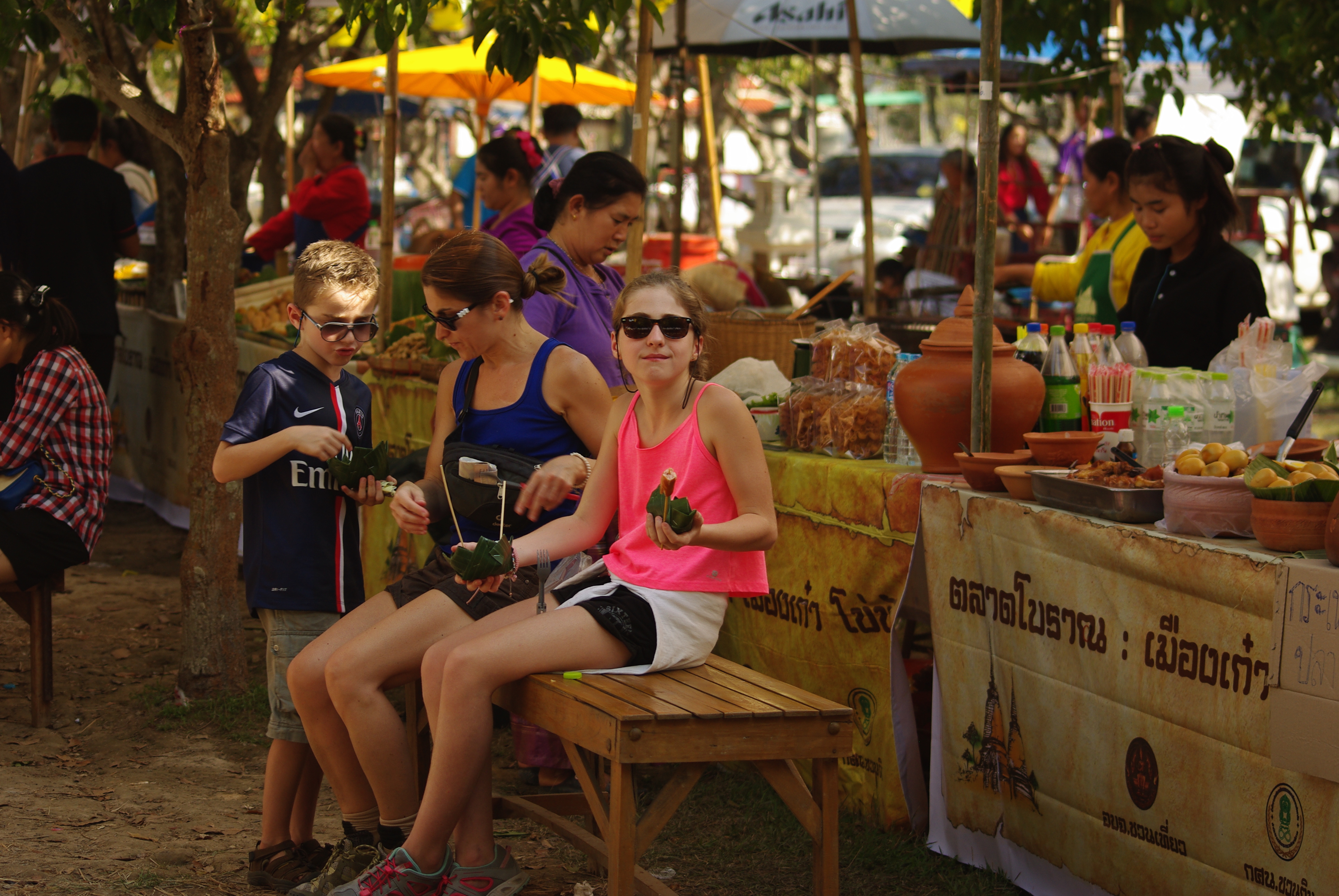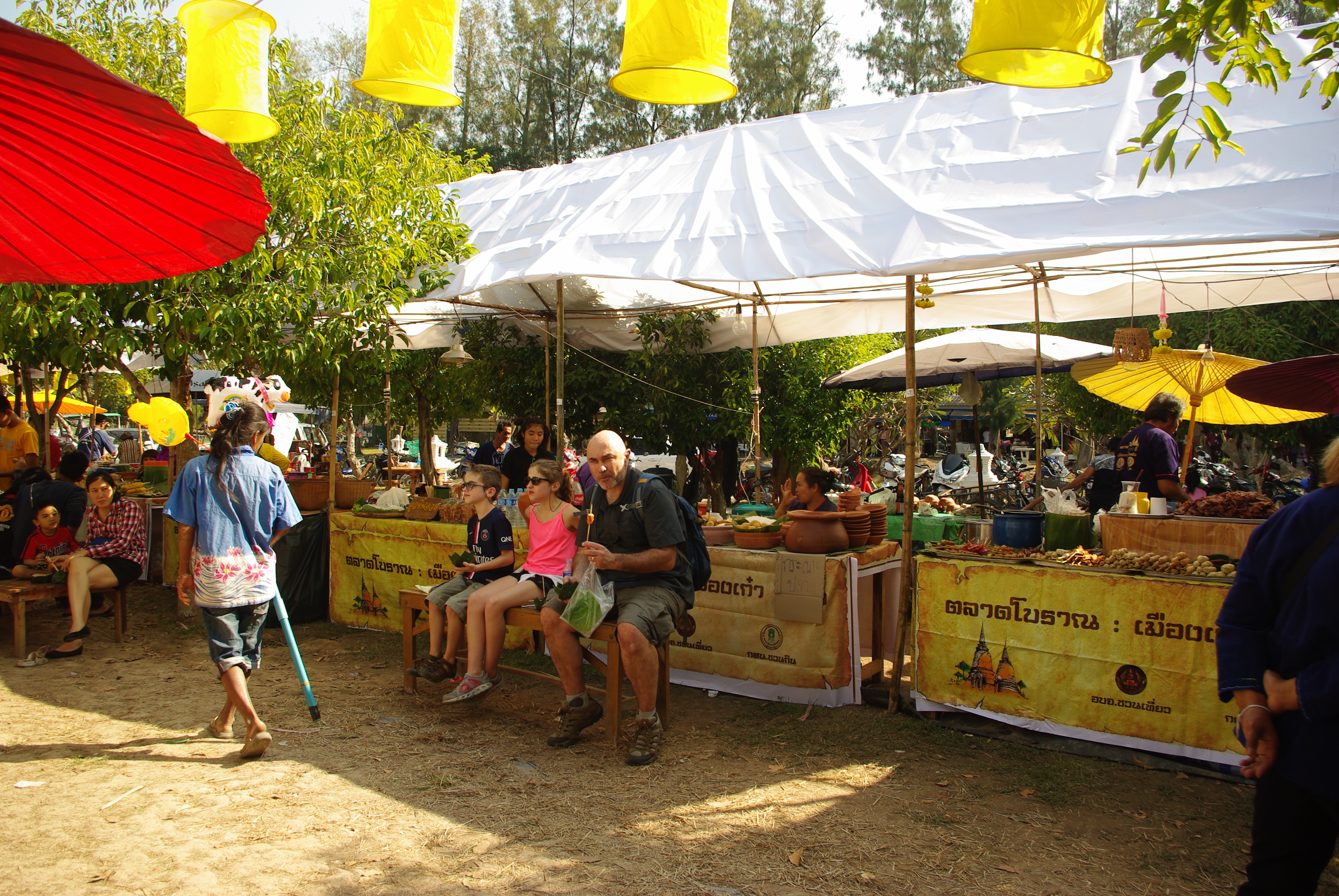 Une bonne journée de vélo à la découverte des temples et monuments (oui, mon truc, c’est le vélo en ce moment, une vraie révélation !) sous une chaleur accablante et un brouhaha d’enfer dû à une énorme fiesta de 2/3 jours pour, d’après ce que j’ai compris, l’anniversaire de l’ex roi de Sukhôthai qui aurait développé la première écriture thaï. Et qui dit fiesta, dit multitudes de stands de bouffe, un vrai régal !