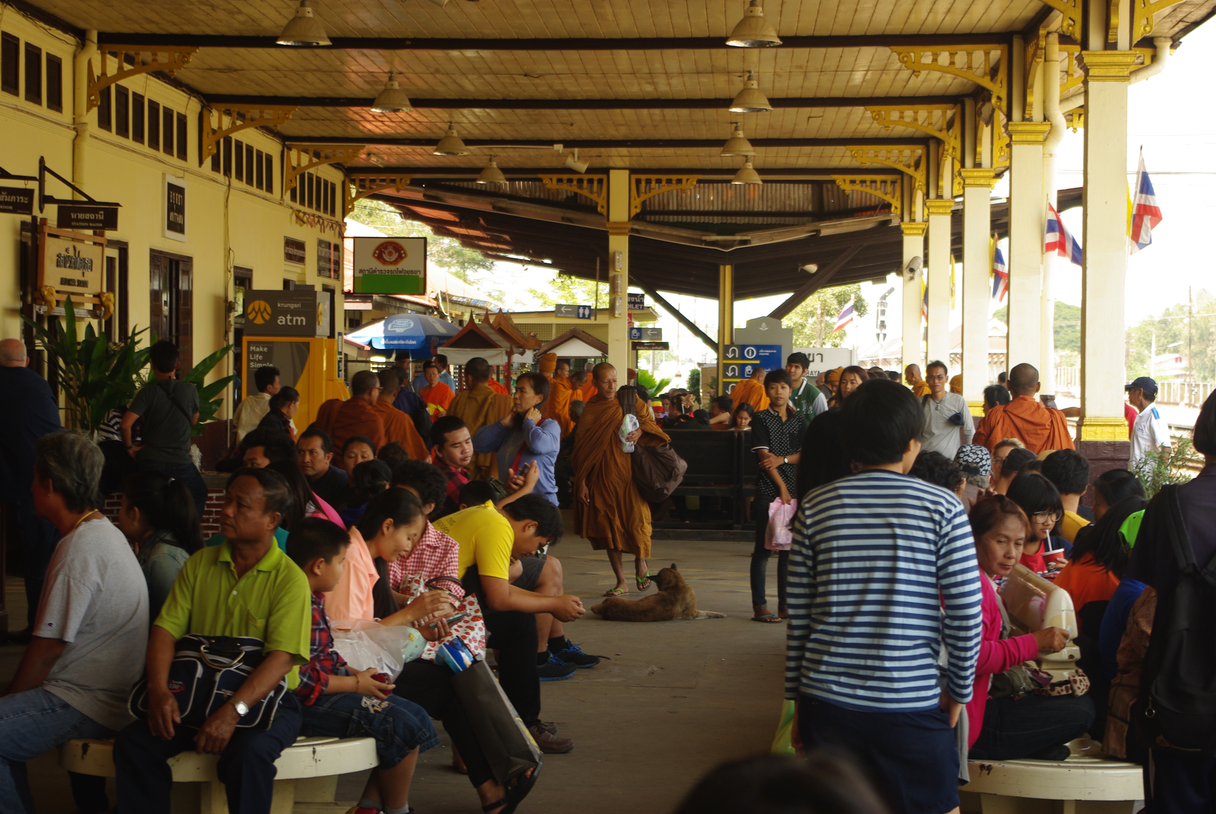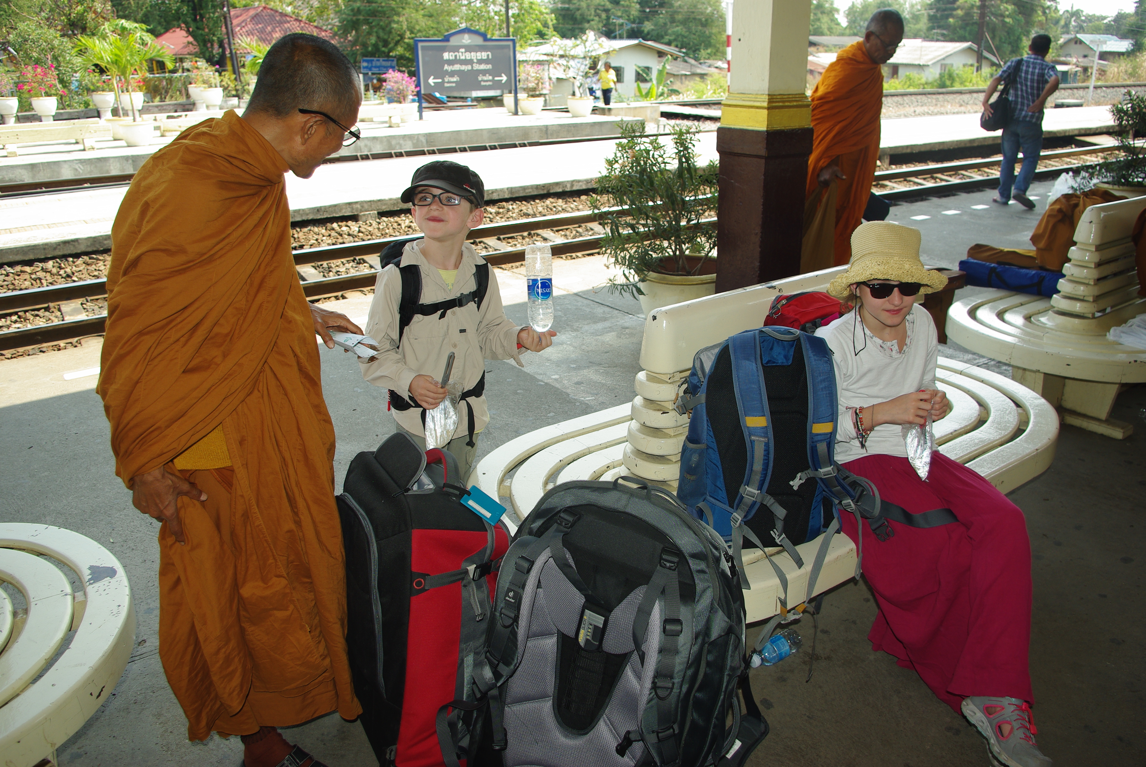 Nous avons pris un tuk tuk jusqu’à la gare routière de Kanchanaburi, ATTENTE, puis un bus (enfin ce qui ressemble à un bus) jusqu’à Suphanburi (2h30 de route), ATTENTE, un autre bus pour Ayutthaya (1h00). Bon là, nouveau tuk tuk de la gare routière à la gare ferroviaire.