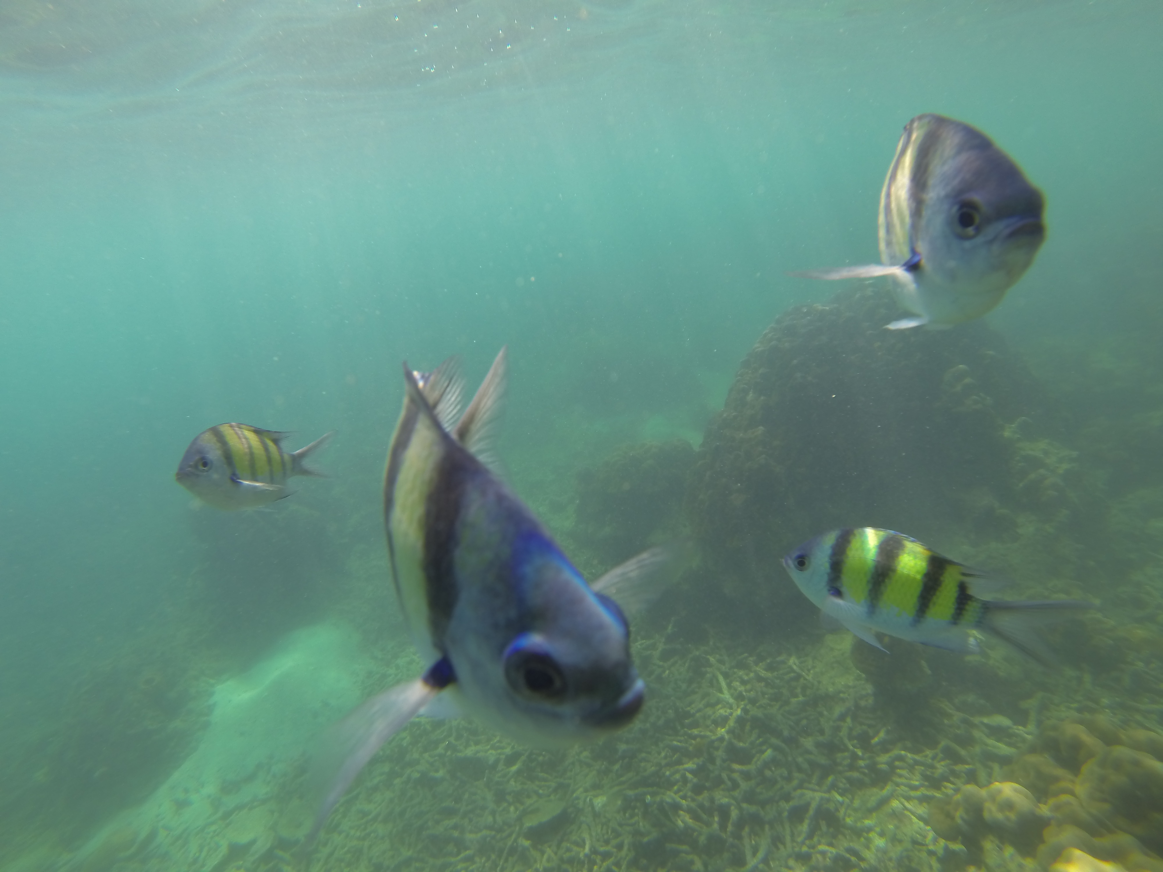 45 minutes de longtail plus tard, nous voici dans l’eau pour deux p’tites séances de snorkeling du style « vie ma vie dans un aquarium ».