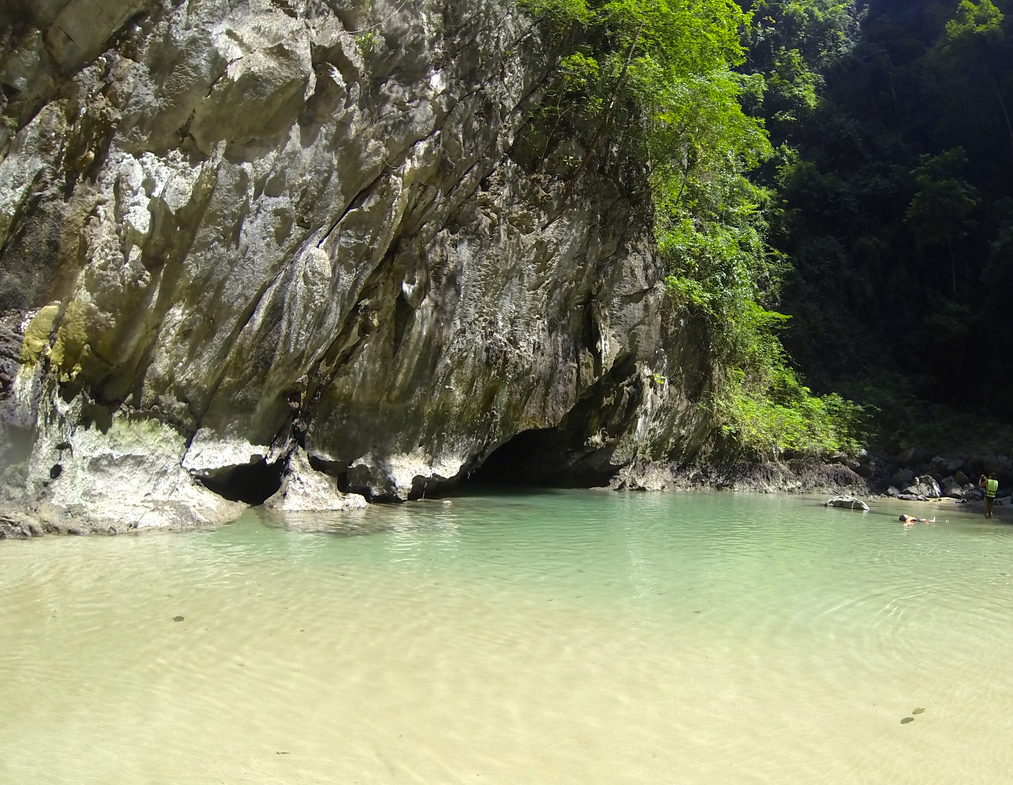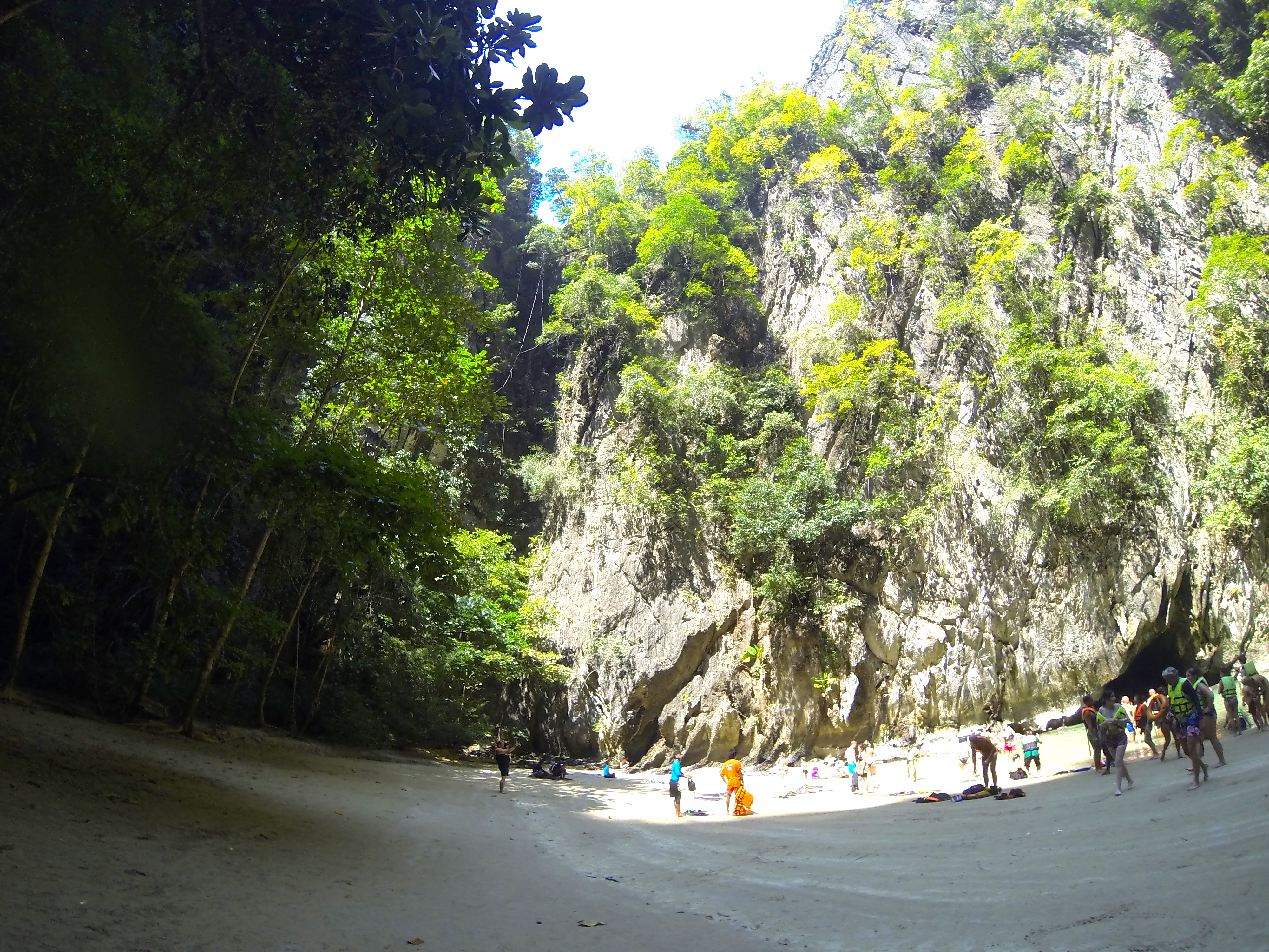 Nous sommes partis ensuite pour un lagon cerclé de montagnes accessible uniquement par le truchement (Celui-là, j’suis content de l’avoir placé !) d’un conduit immergé long de 80 mètres et en partie dans le noir. « Morakot Cave » puisque c’est son nom servait à l’époque de repaire à des pirates qui planquaient leurs trésors dans ce lieu introuvable. Bon, de nos jours, le lieu est tellement touristique qu’il ne doit plus rester beaucoup de trésors mais même avec ces nouveaux conquistadors, l’endroit est magique !