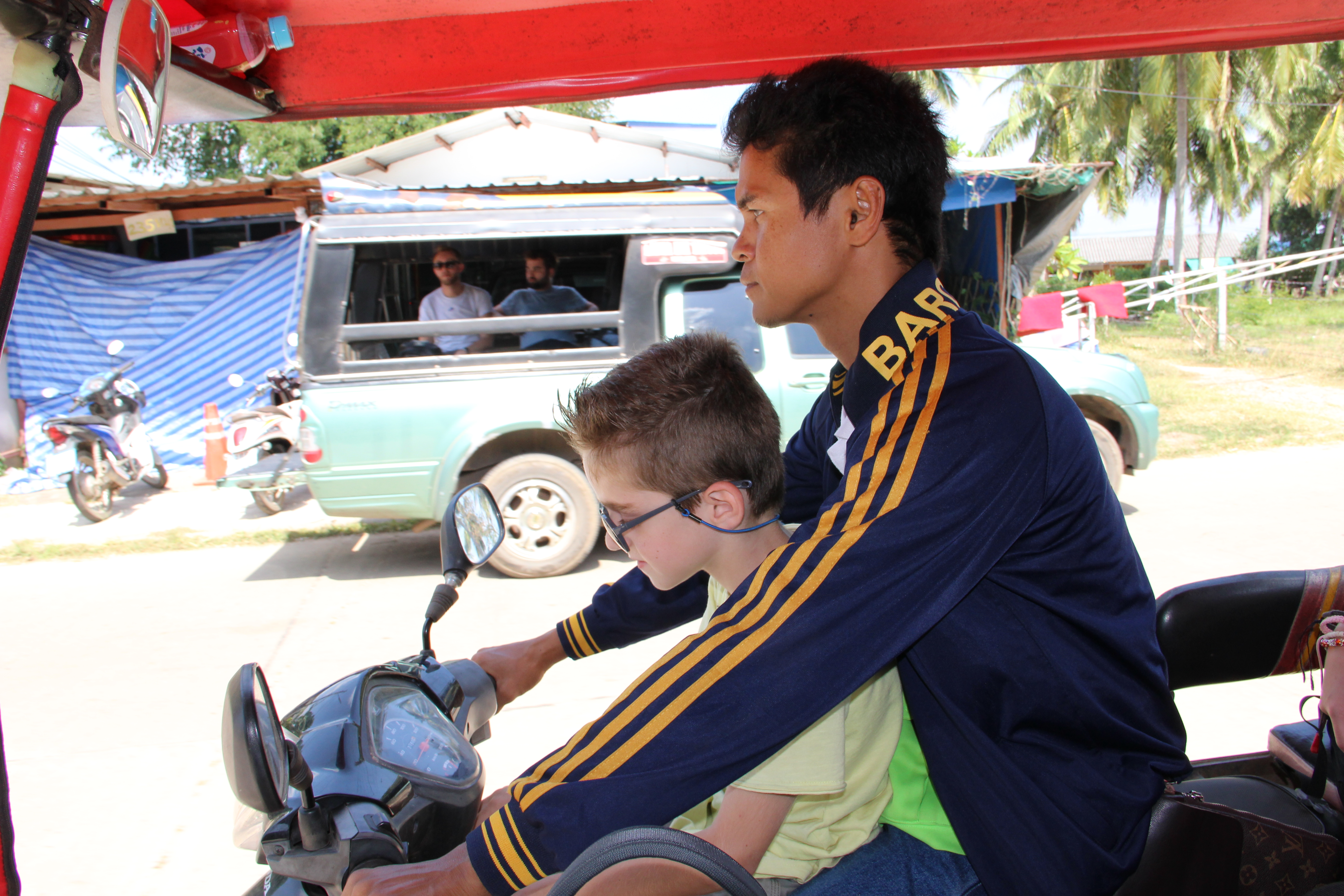 Du port, nous rejoindrons notre hôtel en tuk tuk local pour la plus grande joie de Noah qui montera avec le pilote ? Chauffeur ? Fou du guidon ? Enfin bref, avec l’un des 45 gars qui vous saute dessus à la descente du ferry. C’est trop cool, on a l’impression d’être super important :