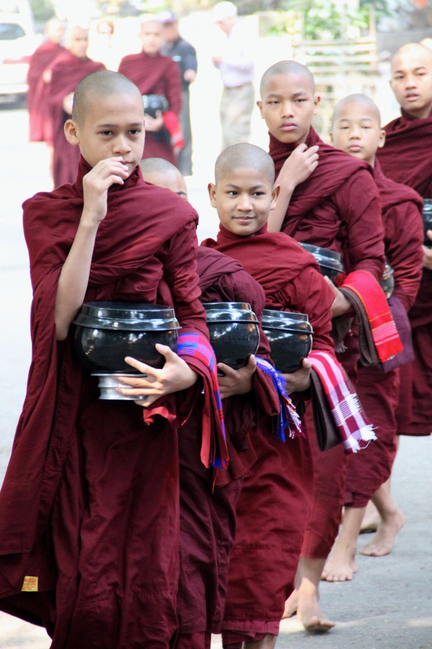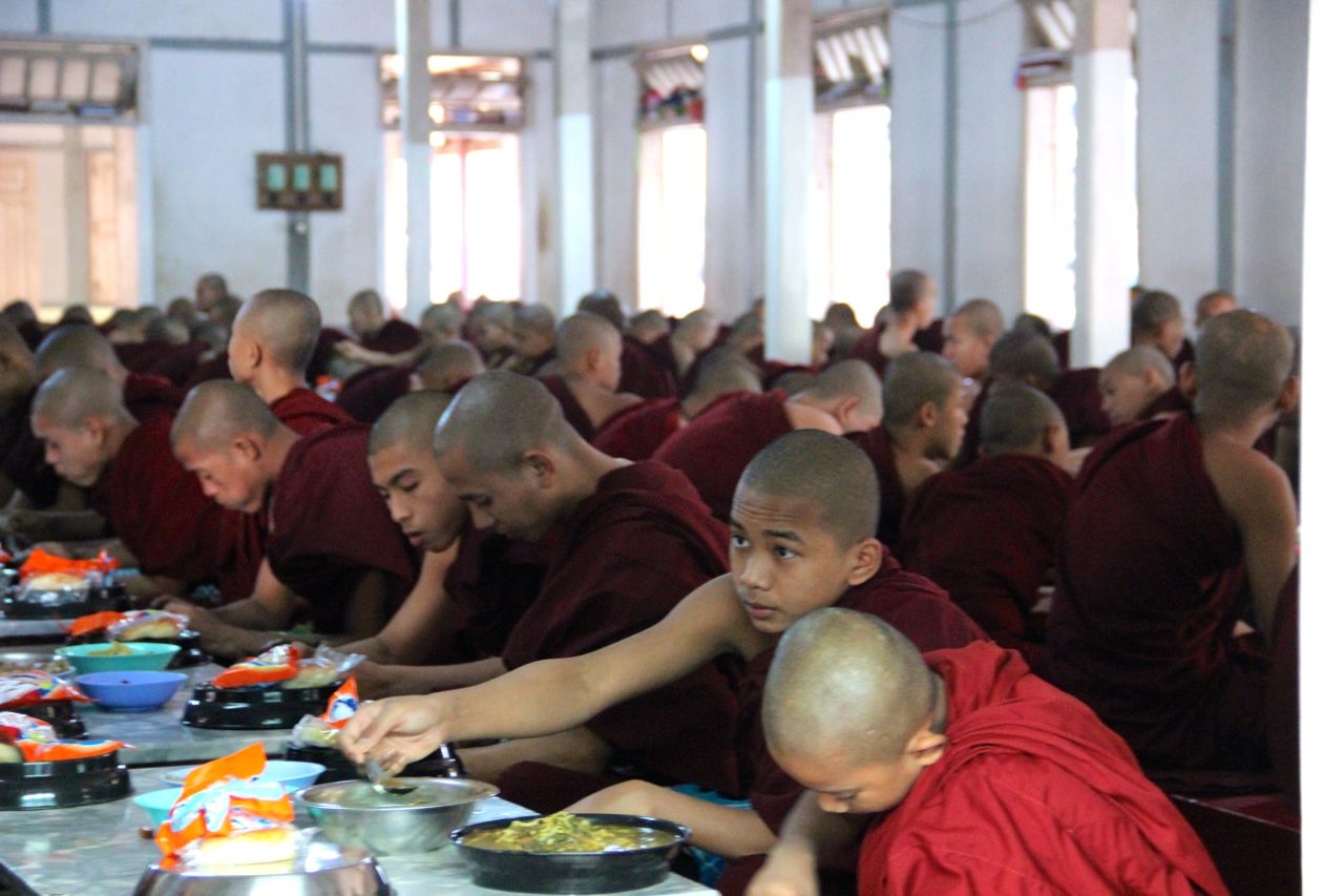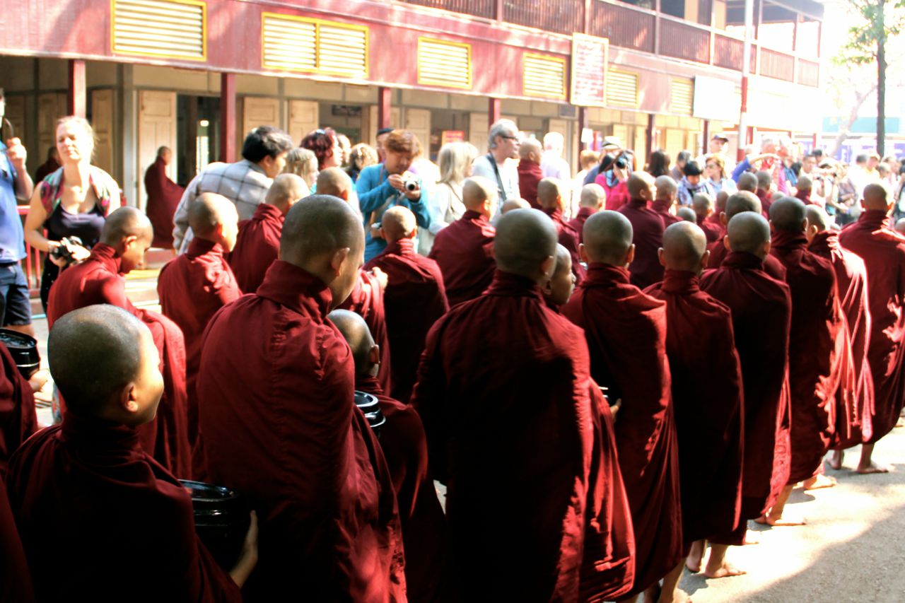 Tout en nous dirigeant vers l’ile d’Inwa, nous nous sommes arrêtés au monastère de XXXX (je ne mettrai pas le nom pour vous évitez d’y aller!) où, selon une brochure que nous avions lue quelque part, la procession des 1300 moines dudit monastère allant déjeuner était à voir absolument. Certes, c’est impressionnant mais c’est aussi dérangeant car c’est devenu une sorte de foire d’empoigne et je me demande réellement ce que les moines peuvent penser de nous!