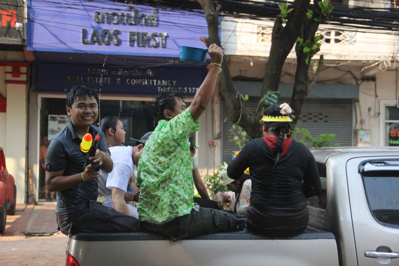 Nous passons donc ces 4/5 jours entre école aux enfants dans notre refuge et sorties dans ce joyeux capharnaüm qu’est Vientiane le temps de Pi Maï. Au cours de cette fête, tout le monde, de 5 à 77 ans (selon l’expression consacrée), s’équipe de pistolets à eau, de piscines gonflables installées dans les rues, dans les Pick-up, de tuyaux d’arrosage, de seaux et autres récipients en tout genre et tout le monde s’arrose dans une atmosphère bon enfant (bon, vu la quantité de Beer Lao absorbée, j’imagine que les soirées sont par contre compliquées pour certains !).