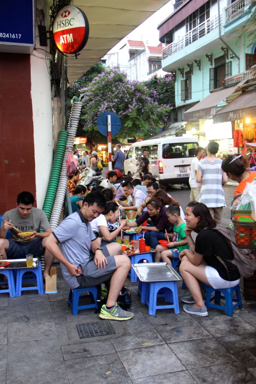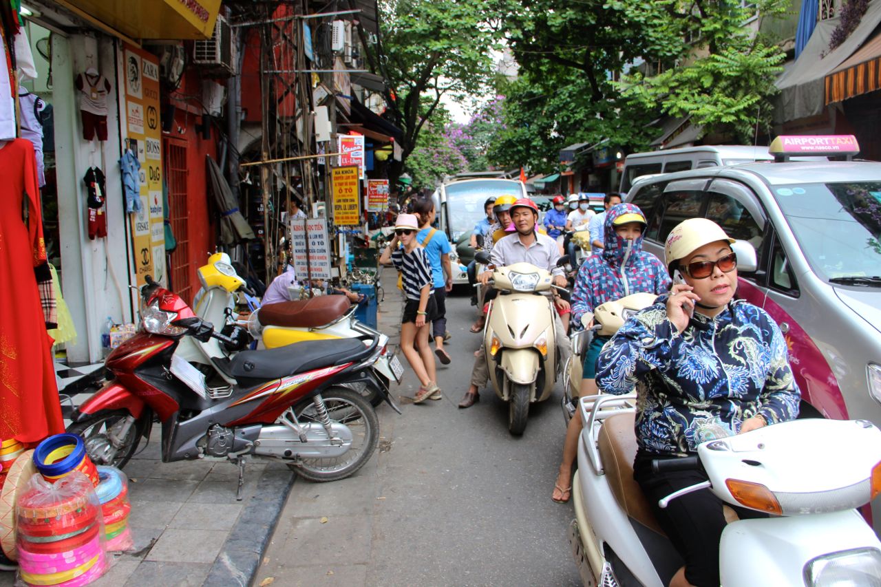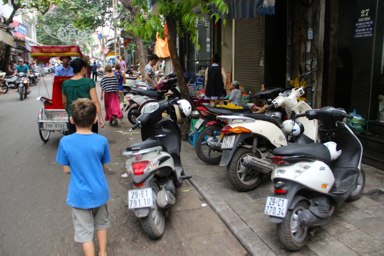 Hanoï et surtout la vieille ville est connue pour ses difficultés à se déplacer à pieds. En effet, les trottoirs sont apparemment réservés à tout sauf aux piétons et le jeu consiste à zigzaguer entre restos de rues, marchands ambulants, étalages commerciaux et surtout les innombrables scooters garés, y compris ceux qui sortent des boutiques (????).
